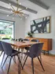 The design team worked closely with the homeowners to find colors and materials that were both contemporary and period correct, spending 10 months in design prior to construction. “The original house was a plain-Jane 1950s ranch that had some nice finish details, such as the beamed living room and kitchen with exposed tongue-and-groove ceiling. We wanted to take the original massing and attractive details and expand these to make the house feel more like a true mid-century,” Chris explains.