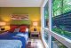 The porch further extends the views into the surrounding forest. But, not being insulated, the space feels the outdoors “inviting itself inside” on chilly nights.