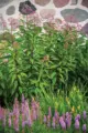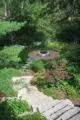 With permission to remove as much of the front lawn as needed, the landscape team decided to use the space for a defined vegetable garden. “Our client is very into vegetable gardening, but the only full-sun location on her property is to the left of the driveway,” James says. A dry creek bed lined with slate chips and aqua-blue granite boulders separates the garden visually from the driveway. “Rather than have the garden stand alone in the front yard, we surrounded it with flowering shrubs and perennials. A limestone slab bridge crosses the creek and leads directly into the garden,” James says. The garden is surrounded with plants that would fit an Asian garden setting.