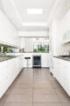 This stark white galley kitchen embodies a minimalist look with parallel walls of white cabinetry with barely there cabinet pulls. All the appliances are mounted, which leaves valuable counter space free. A skylight and view out the sliding glass door keeps the room from feeling overly stark.