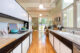 This kitchen has more ample space than a typical galley kitchen, but the heart of it is designed around a galley layout. The design balances wood, white and mint green cabinets, which harmonizes for a calming effect. The kitchen design also takes advantage of the home’s vertical storage opportunities with its high ceilings.
