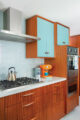 The cabinetry in a galley kitchen is prominent, so why not make sure it’s something you love to look at? The combination of warm grained sapele wood cabinets and turquoise laminate cabinet fronts gives this kitchen an inviting and playful touch. Backsplash tile and a judiciously chosen espresso machine in complementary orange provide another opportunity for pops of color and a sense of fun.