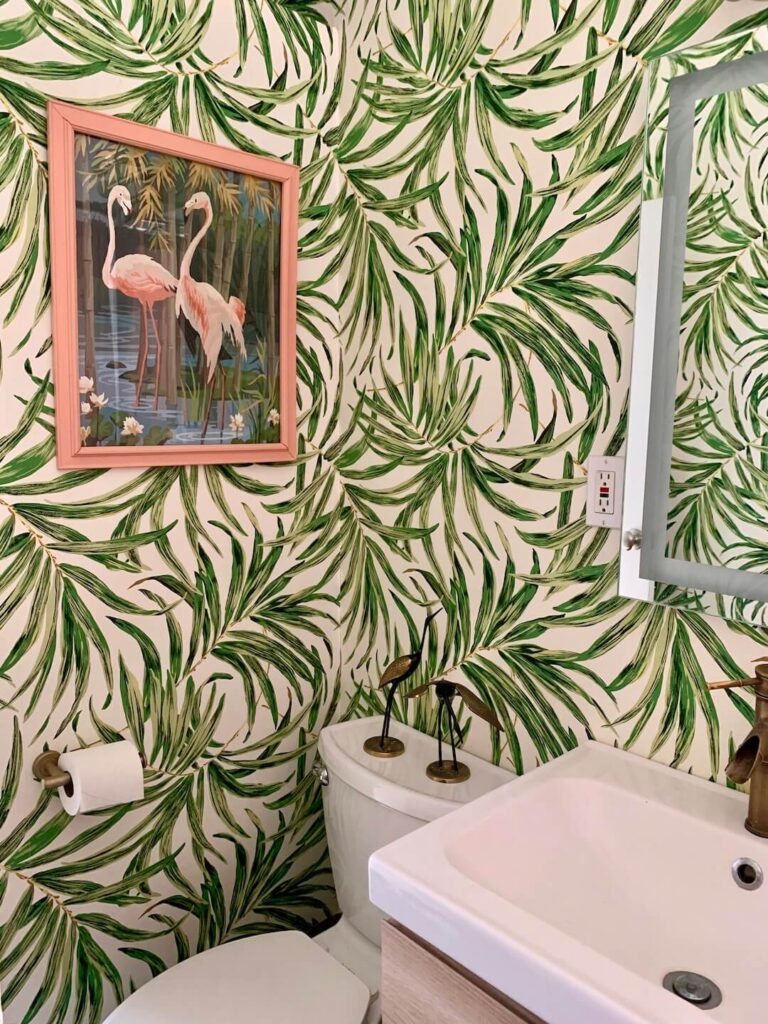 First up was the bathroom, which the Birds undertook themselves with the help of Erin’s dad. A tropical theme brightens the space and suits the MCM aesthetic.