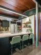 “Our goal was to treat the house as much as a museum as we could,” she says. “And these original bathrooms have one-of-a-kind features you can’t find anywhere else.” The bathrooms have built-in wall scales and aluminum grids framing the avocado green or blue laminate. “The bathrooms kind of remind me of those you might find in an airplane,” Lee says. “They might be the only two Alcoa original bathrooms left, so I knew I had to restore them.”