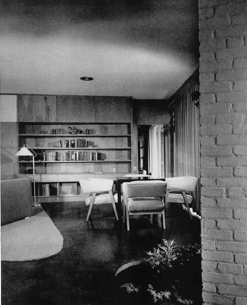 The over-arching use of continuity further provides the open feeling of indoor-outdoor living originally requested of the layout. “The general plan of the house achieves a feeling of spaciousness and flexibility. The dark stained terraces stepping out from the black asphalt floors; the plastered ceilings picked up by the plastered underside of the overhang, and the long wall pulling the inside outward, all tend to increase room sizes,” states the original publication from Arts & Architecture.