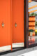 Orange doors are just the beginning here! Starburst doorknob mounts, a tripod plant stand with a brass planter that ties in perfectly with the door accents are the mid mod cherries on top.