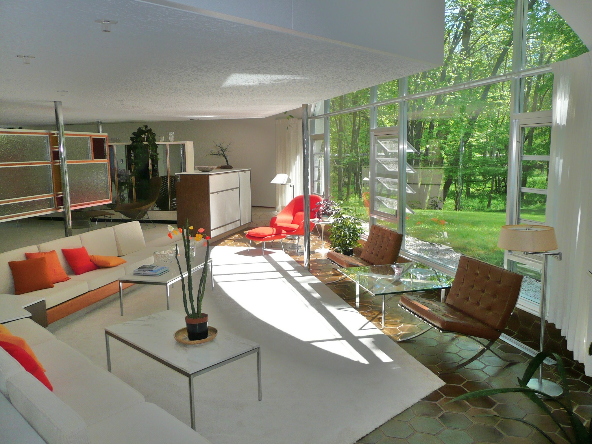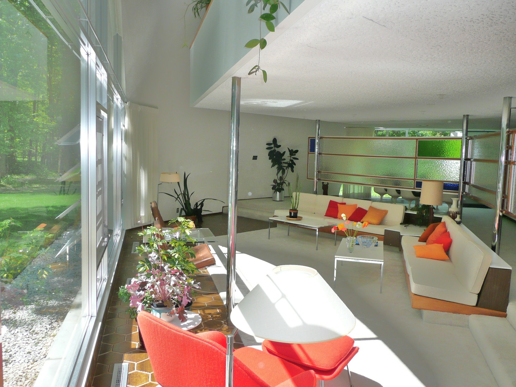 Though Schwartz is credited with designing or co-designing no less than 32 structures in the area, the Dome Home is known as the Midland native’s crowning glory (along with the United Church of Christ). Schwartz lived in the house with his own family until he died in 2010, furnishing it with mid century classics such as an Eero Saarinen Tulip table and Mies van der Rohe Barcelona chairs.