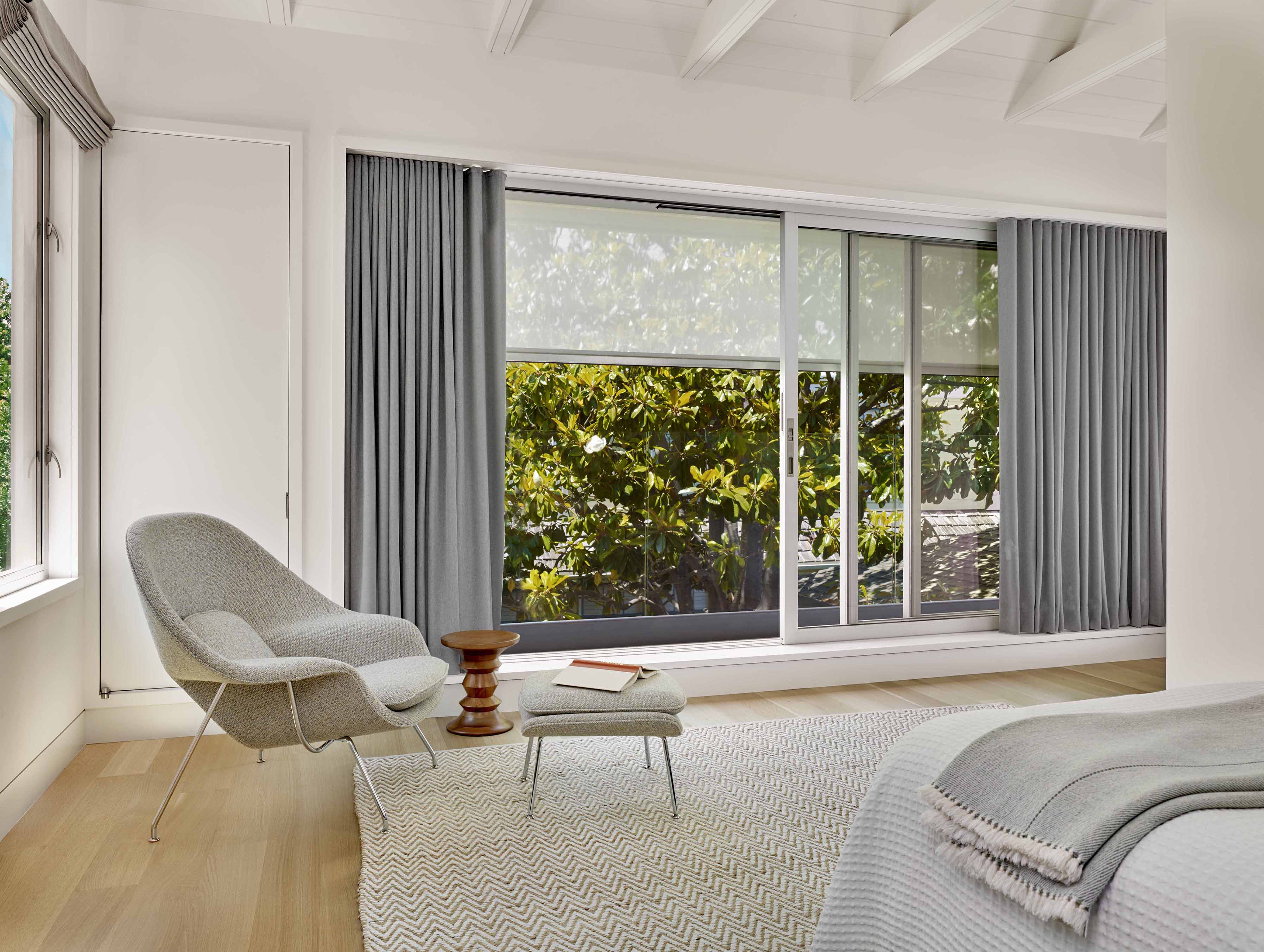 Completed in 2018, the second level construction measured 700 square feet and adds natural lighting for the staircase and rooms below. Looking at the healthy magnolia tree from the bedroom gives the new upstairs master a tree-house feel. The view from the full-wall sliding windows is beautiful and safe, thanks to an invisible glass safety rail dissolving another boundary. Exterior shades and deep overhangs control harsh light in the afternoons. The second level blends with the existing wood siding and shingle exterior of the original house. However, the top level also stands out with a state of the art Equitone rainscreen wall and air barrier.