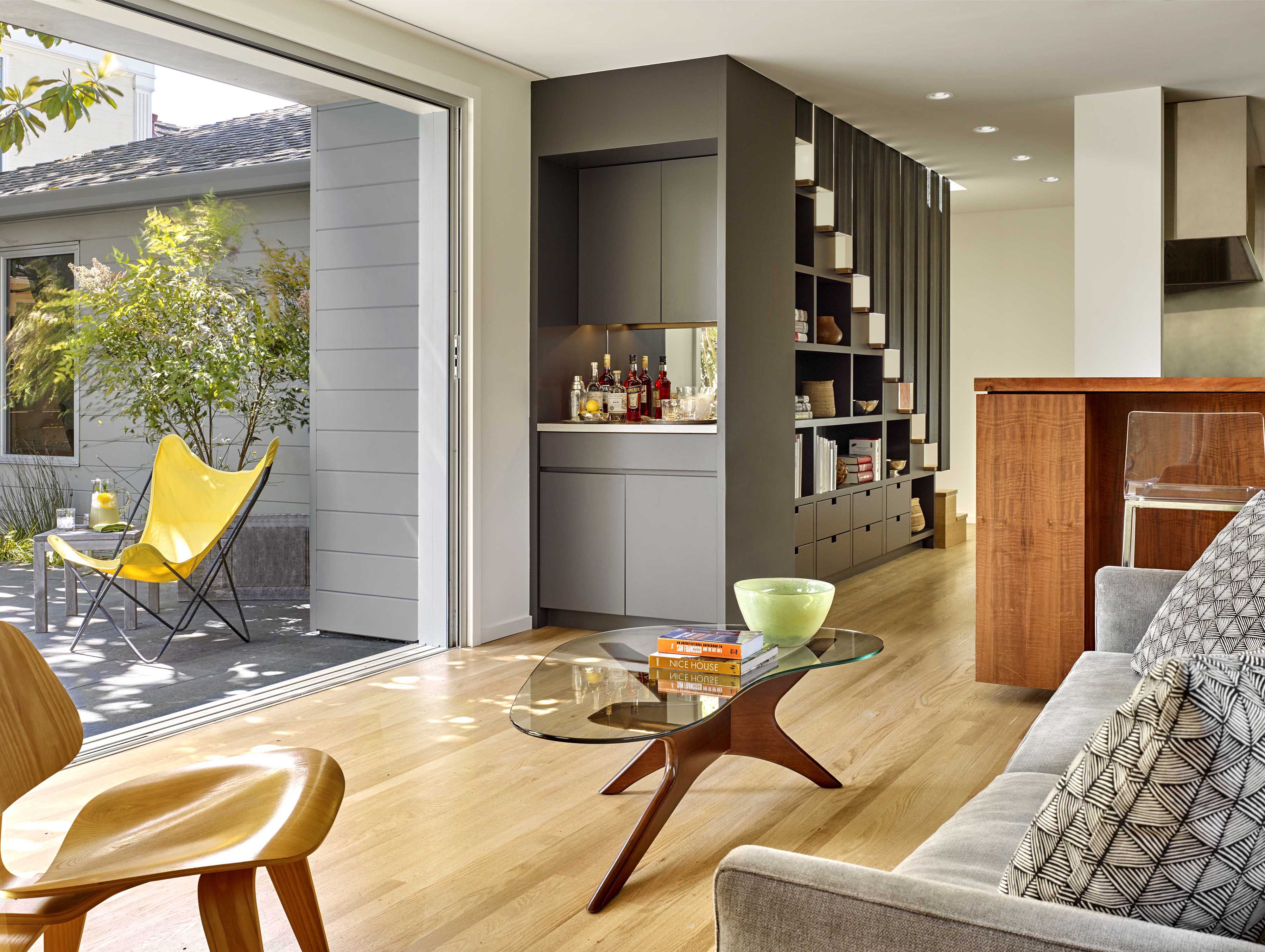 Built in 1952, the Berkley home design needed some updates and better lighting throughout. The kitchen was the starting point of the renovations to get the foundation work for the upstairs addition put in place. Once the kitchen was complete in 2012, work started on the second level master bedroom. Opening up a dark and narrow hallway, a staircase replaced storage and mechanical closets. To maintain the functionality, shelves and storage space added to the custom stair design. In addition, a bar sits just inside the sliding glass door.
