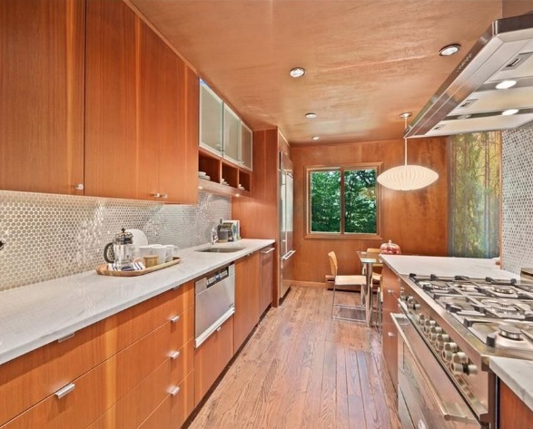 “The Salem Road residence is the quintessential country getaway. The residence, spectacularly nestled in its private setting, overlooks scenic gardens, pool and woodlands. A classic Mid-Century Modern, the original structure was built in 1956. It has been carefully restored preserving the defining elements of the true modern style. Designed by David Henken, a disciple of Frank Lloyd Wright, it was and built by renowned local builder Vito Fosella. With 3162 square feet of living space, the structure houses eight main rooms on two levels. Interior spaces are stunning. Rooms are perfectly proportioned and positioned to capture light and views. With a soothing urbane aesthetic, natural materials were incorporated into the design. Slate and wood floors, seamless mahogany paneling and ceilings, mitered glass windows and three fireplaces add architectural interest.”
