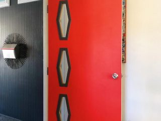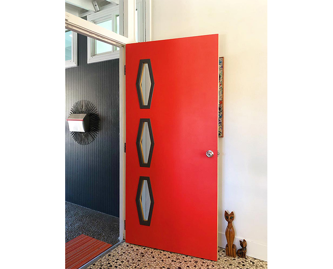 I’ll admit, I have a thing for doors. This bold orange specimen with its three geometric windows is the perfect first impression for what’s inside.