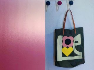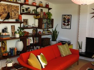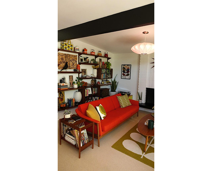The sofa certainly makes a statement, but the shelving across the back wall caught my attention! I loved all the pieces by Orla Kiely and Catherine Holm arranged with other fun vintage items. I’m adding an Eames House Bird to my wish list.