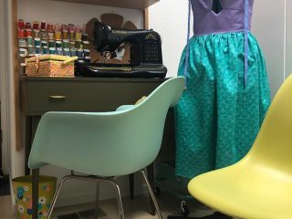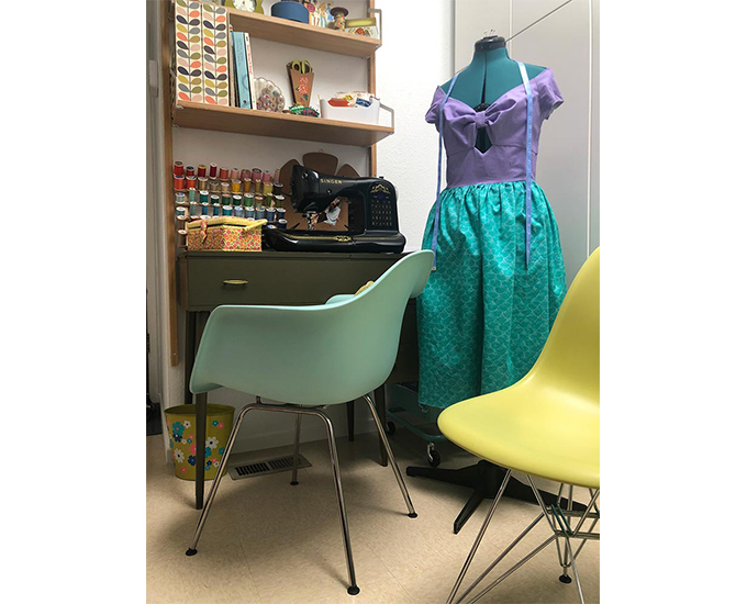 A small room just off the entry is dedicated to sewing, with authentic retro furniture like the desk and these Eames Molded Shell Chairs. The homeowners are a creative couple with a love for vintage Disneyana, so I’m willing to bet that dress is giving The Little Mermaid’s signature look a Mod twist.