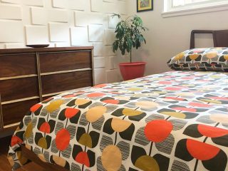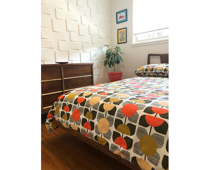 The textured wall in this guest room is a playful touch!