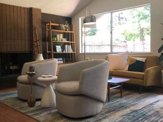 West Elm Sacramento sponsored the home’s interior styling for a look that layers comfort into the dramatic architecture. These chairs swivel toward the sofa for conversation and toward the TV for entertainment.