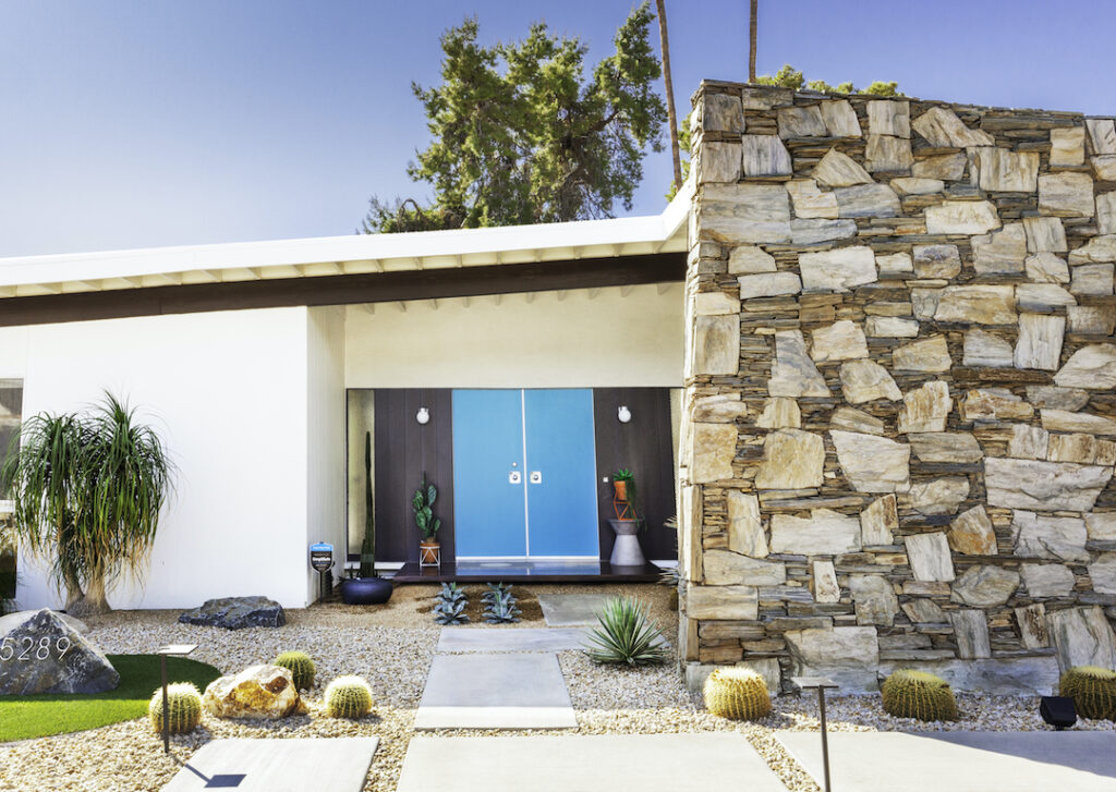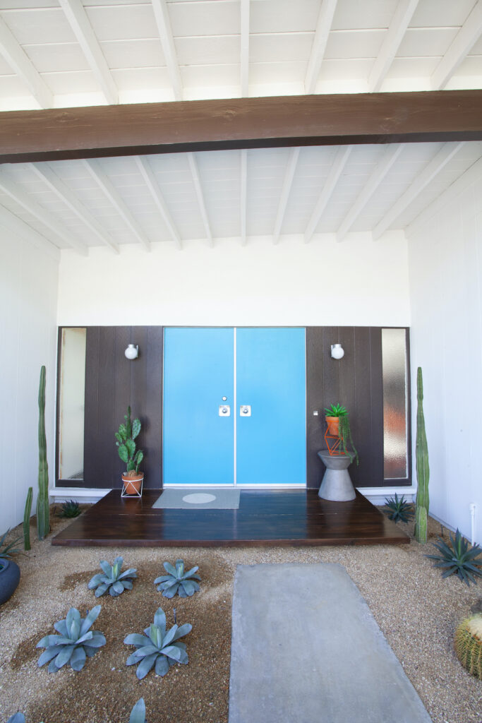 For the exterior, that meant new landscaping and paint. Cypress trees that covered the original rock walls were removed, as was the lawn. New desert landscaping was installed. The door radiates in Behr Island Dream, a shade that ties in with the interior color palette. Refreshing the door revealed more original touches.
