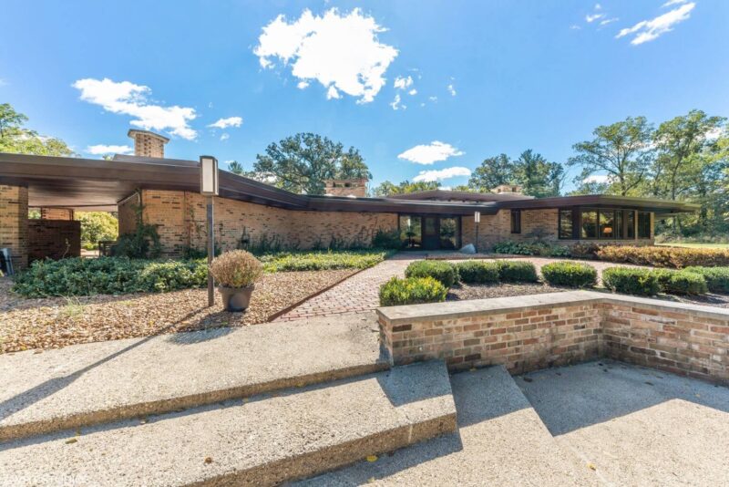 The home’s story begins in the 1950s with Trowbridge, who hired Frank Lloyd Wright to design the home in the western suburbs of Chicago. Due to disagreements, Frank Lloyd Wright terminated the relationship. The actual architect remains unknown, but the home bears many Usonian hallmarks such as an absence of square rooms in favor of trapezoids and other geometric shapes. Cypress ceilings, bluestone floors, several brick walls, ample windows create contrast and a beautiful earthy feel. The four-bedroom home contains many wood screens, and sits on a serene wooded property.