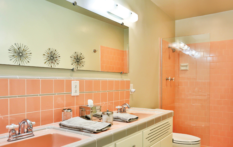 A lot of elbow grease got the tiles cleaned, and a hand-rubbed polish made them shine like new. The pink bathroom of Lisa’s dreams was becoming a reality. After some research, Lisa found the essential pink-and-gray tile needed for the new vanity at B&W Tile in Riverside, CA, which specializes in hard-to-find tile from the mid-mod era. She promised Steve that she’d incorporate gray tile for neutrality, and Steve conceded. “She was right. Everyone’s skin tones look great in a pink bathroom,” he said.