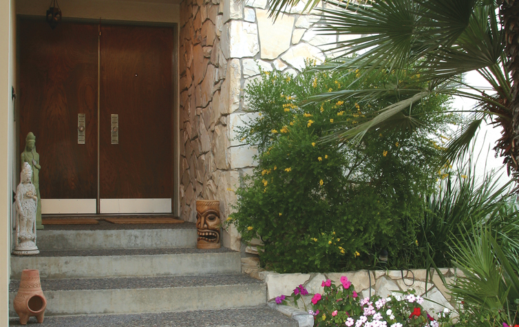 And we continued to find fabulous details: a makeup table in the master bath with a three-panel mirror; built-in hampers and a bright orange hairdresser’s sink in the laundry room; and in the hallway stereo cabinet a shelf with an old label that read “polka records.” Outside on the patio was another barbecue, this one set into a large rock table with seating for eight.