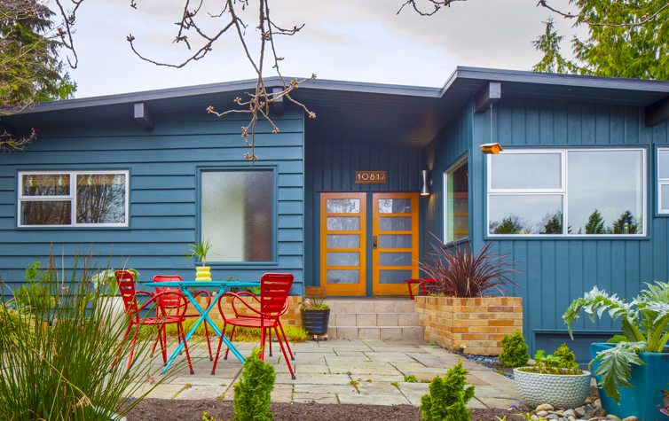 The rambler’s exterior looks much the same as when the home was built, with only minor modifications. The previously floor-to-ceiling dining room windows were replaced with more energy efficient Milgard double-paned aluminum frames, and the Campbells painted the dark brown cedar siding a period-perfect slate blue.