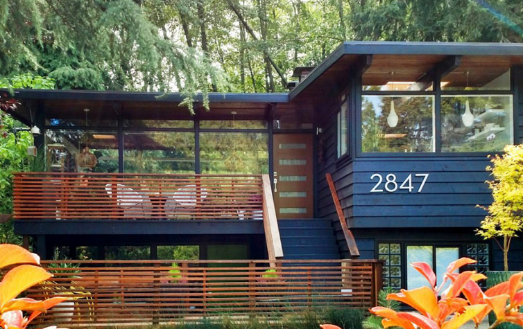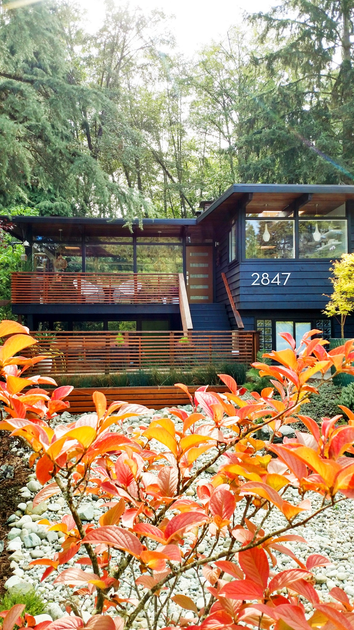 Nature takes the limelight in this 1958 John Burrows house. The residence’s dark, dramatic exterior (“Caviar” by Sherwin Williams), inspired by charred Japanese wood called Shou Sugi Ban, distracts from the fact that it is a man made structure among the Lake Forest Park woods in Washington.