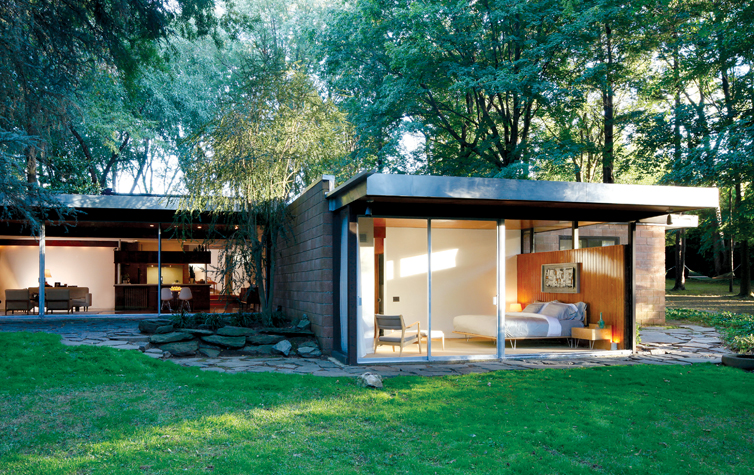 The master bedroom epitomizes the beauty of Neutra’s architecture. Note the stainless steel fascia board and the Jens Risom armchair and ottoman.