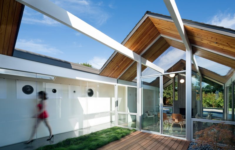 When homeowners Jonathan Halderman and Jackie Brooks wanted to renovate their dilapidated 1960s Quincy Jones-designed Eichler ranch, they called Curt Cline at Modern House Architects. In order to get the house they wanted, Cline would have to rebuild the home up from the slab work. The A-frame house was badly in need of repair, but Cline honored the original aesthetic, taking cues from other Quincy Jones homes and keeping the original floorplan intact. The plan was striking, its most notable feature being a large central atrium. For the remodel, Cline highlighted the floorplan’s open-air feel by replacing many of the walls with glass. He used flagpoling to achieve the large expanses of sheer glass, sinking 4-inch steel columns into the footing to support it.