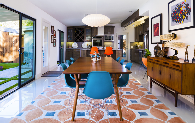 The things he likes includes a collection of Sputnik-era memorabilia, from framed prints of LIFE magazine featuring the first astronauts and their wives to model rockets that sit atop a tall midcentury bar. The rest of the home is meticulously decorated with vintage and reproduction furniture and home accessories, including loungers by Eames and Mulhauser, Majestic Z boomerang table lamps, rare 1950s Mirro Medallion candlesticks, and an original painting by Modernist artist Charlie Harper. On the back patio, a vintage Ames Aire patio set and chaise lounges provide a place for guests to relax by the pool.