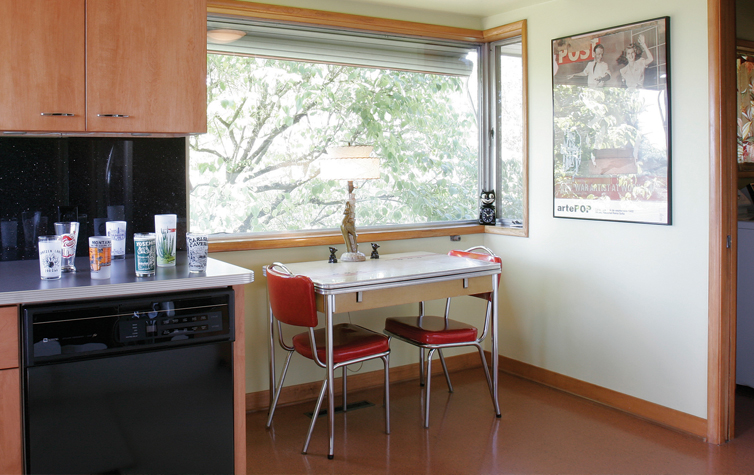 “We didn’t want the kitschy, fuzzy-dice, jukebox, black-red-and-teal look, but we liked the touch of metal,” Jon says. “We wanted it to look like an upscale ’50s kitchen with some vintage details like the soffits and the rounded display shelves,” Karen adds. “When you just have an empty room with a plywood floor, it’s hard to picture what it’s all going to look like. It’s not easy making the choices.”