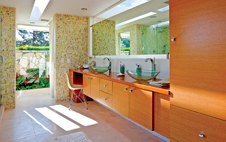 Jay: “Julienne had had a vision of her ideal bathroom for many years, and this was her chance to finally realize it. We put in a huge glass slider by the oval bathtub, and have glass everywhere else in the room, including two skylights in the roof. We built both indoor and outdoor showers so that in the summer we could shower outside. There’s also a stone planter wall for privacy from the driveway, and everywhere you look, you are surrounded by nature and greenery.