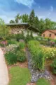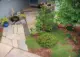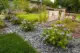With permission to remove as much of the front lawn as needed, the landscape team decided to use the space for a defined vegetable garden. “Our client is very into vegetable gardening, but the only full-sun location on her property is to the left of the driveway,” James says. A dry creek bed lined with slate chips and aqua-blue granite boulders separates the garden visually from the driveway. “Rather than have the garden stand alone in the front yard, we surrounded it with flowering shrubs and perennials. A limestone slab bridge crosses the creek and leads directly into the garden,” James says. The garden is surrounded with plants that would fit an Asian garden setting.