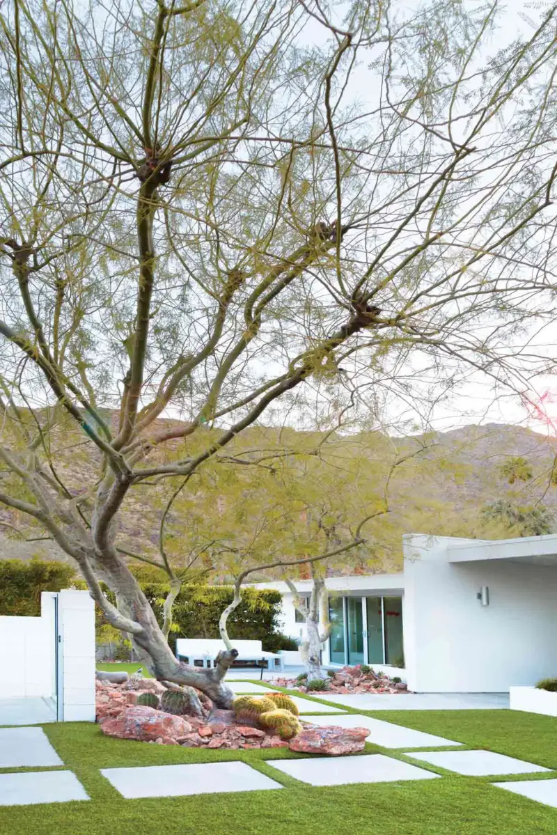 Paul Ortega, landscape and outdoor living program captain for Modernism Week, organizes the tour and shares his favorite features of Sarah’s exterior: “The walled front garden has an intimate scale upon entering, much like a courtyard entrance with mature Desert Museum Palo Verdes that form a pleasing canopy overhead. Then the backyard has its own contrasting identity, with unexpected wide-open mountain views and a much different scale than the front.”