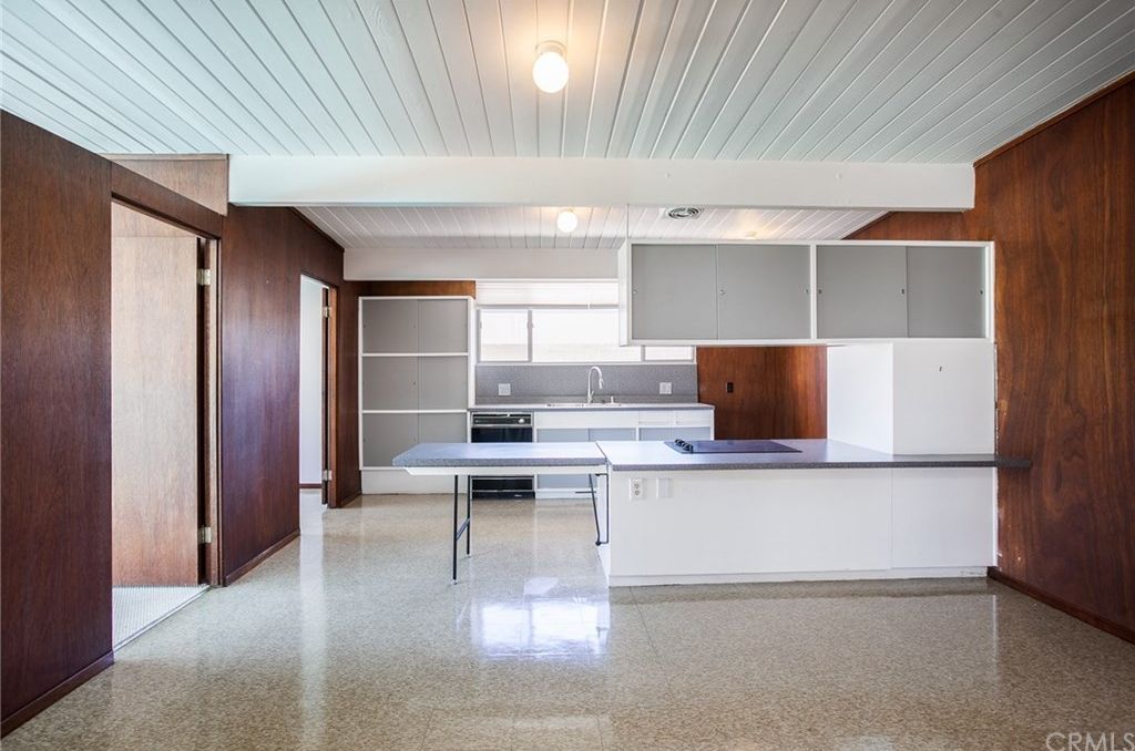 Hello, curb appeal! This breathtaking mid century home epitomizes easy indoor / outdoor living. According to the listing, “concrete floors compliment the waterfall quarts kitchen counters.” Brimming with great period details, like wood-clad sliding closet doors and orb lights, we’d happily come over for your housewarming party.
