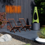 A. The flooring in the seating area features a click-and-lock outdoor decking system from Ikea. It’s proving to be an excellent, cost-effective, and easy-to-clean surface that helps define the space. I furnished the area with 2 acacia lounge chairs from Ikea, a vintage slat bench/coffee table that expands for additional seating, an avocado Modfire propane fireplace, side table from CB2 (no longer available), and sculptural pottery from West Elm (no longer available). I repurposed 2 pieces of wall art from CB2 to hang on the fence for a living room feel. These metal sculptures were originally brushed nickel, but I gave them a vibrant pop with a few coats of bright orange spray paint.