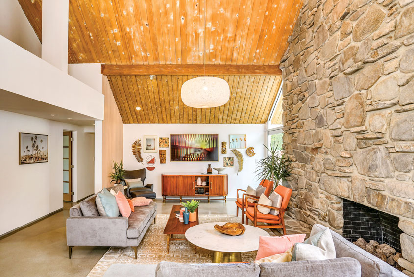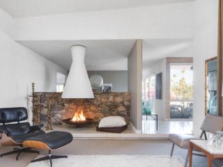 This Oceania-inspired home in Palm Springs was built by Charles Du Bois and is one of his famous “Swiss Miss” homes. Just as beautiful inside as it is outside, the home features this jaw-dropping stone fireplace—imagine curling up next to this enormous hearth! But when the current owners purchased the home, the fireplace was covered in tile! Thankfully, that was soon rectified. Check out more of this fun Mid Mod home here!