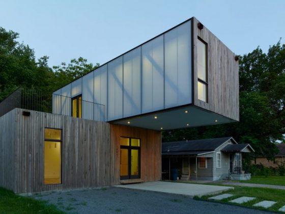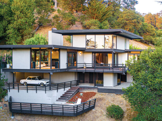 Joseph’s friend John Labus, a design manager for a large technology firm, came up with the idea of removing the sunroom and extending the roof to create a new carport. To further highlight the original modernist design, the architecture team nixed the crumbling front stoop and added a wrap-around floating deck and concrete stairs. “We took inspiration from the big windows and the roofline and just turned up the volume,” Joseph says.