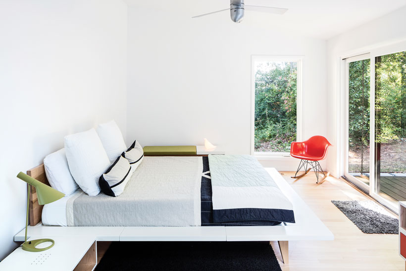 The clean lines and airy feeling are carried through in the master suite, with lofted ceilings, sliding glass doors leading to a private deck and a sky-lit shower. Minimalist furnishings and views of the wooded lot keep the space uncluttered and calm. At night, the moon shines brightly through the frosted glass bathroom partition, giving the room a serene glow.