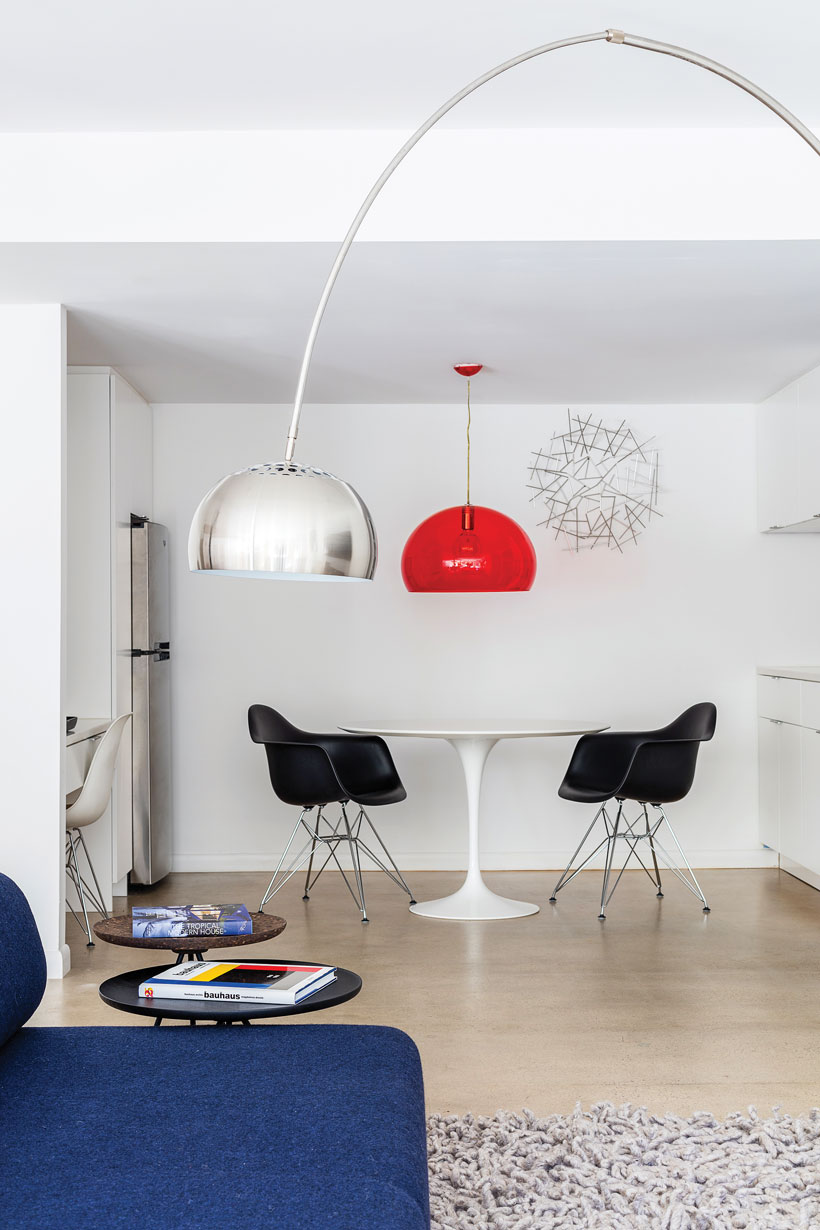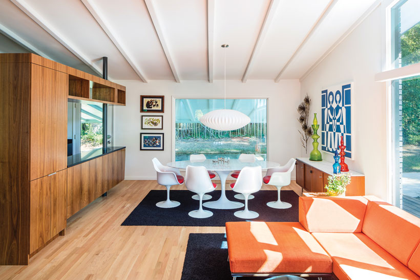 Modernist furniture and art throughout the house complement the original design without feeling overdone. Boldly-colored sectionals in both the upstairs living room and basement entertainment space invite guests to gather for cocktails and conversation. Sculpted Eero Saarinen chairs from Knoll nestled under a Nelson Saucer Bubble Pendant lamp in the dining area emanate a retro vibe. Walnut veneer custom cabinetry and black granite countertops in the kitchen reflect the home’s mid century roots, while commercial-grade Jenn-Air appliances offer modern convenience.