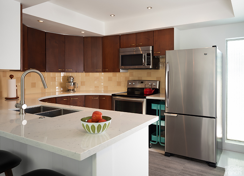 To that end, they first removed the carpet and linoleum flooring, leaving just the concrete, which they then painted white. New baseboards, fresh paint throughout the entire interior and new electrical outlets and switches provided a base layer of freshening. The most unique and challenging feature of the renovation process was the curved kitchen. Maintaining this was a high priority for Rachel because of its authenticity to the era.
