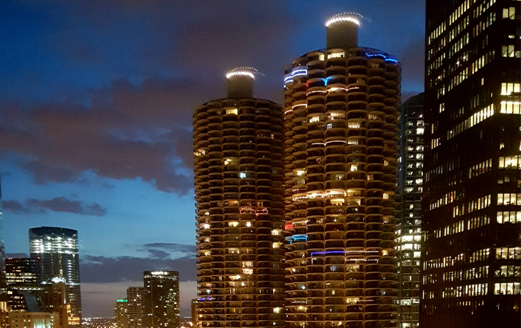 Architect Bertrand Goldberg was a student of Mies van der Rohe, and their shared value for modernist efficiency is evident. Goldberg, however, developed his own distinct style. According to the Chicago Architecture Foundation, “Goldberg believed that since no right angles exist in nature, none should exist in architecture.” This insistence shows in Marina City’s radiating, petal-like design.