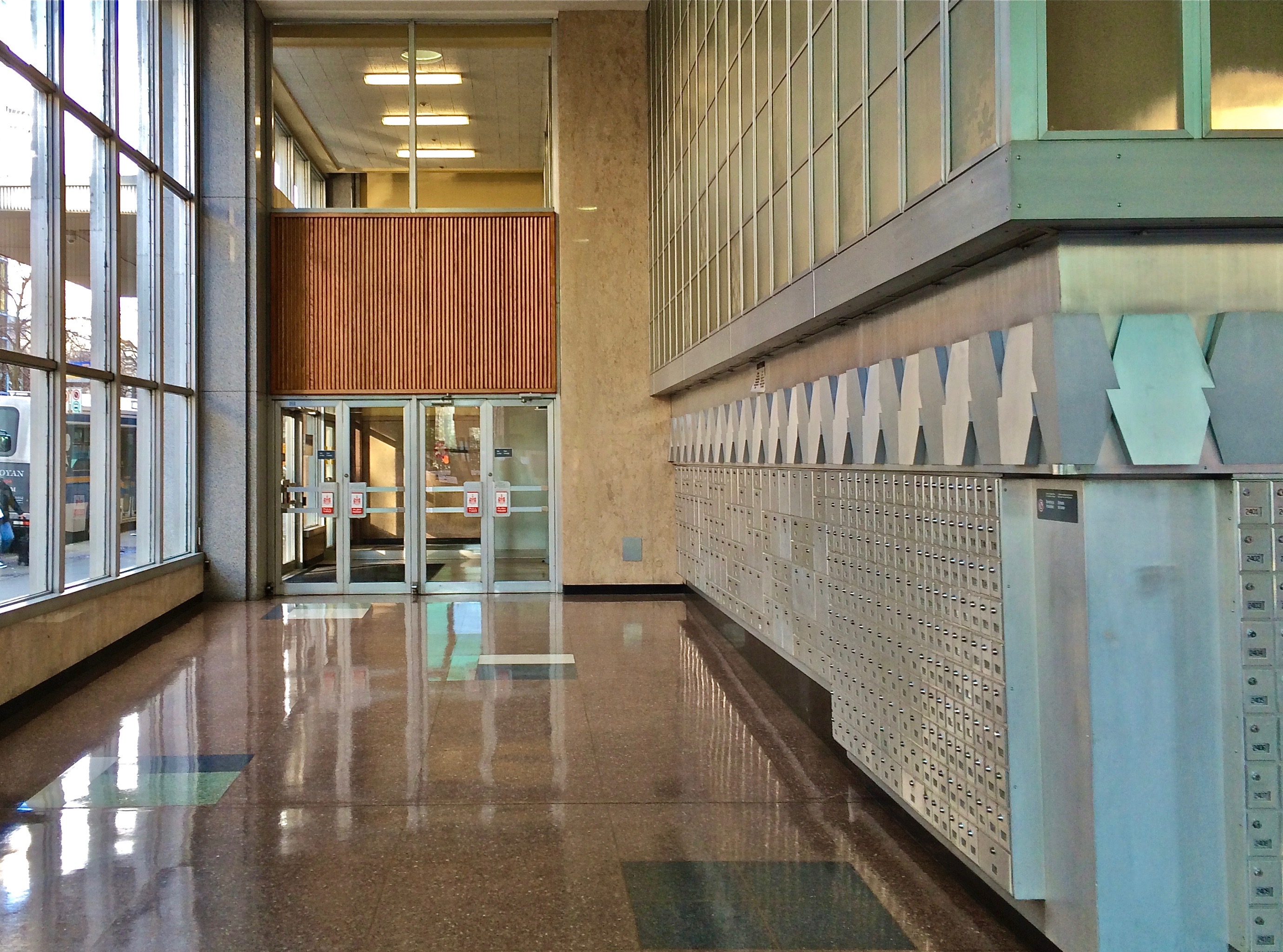 During construction of this massive 5-story International Style building, which served as Western Canada’s primary mail sorting facility, advanced technologies of the day were applied while the finest of quality finishing materials were used, including polished granite, terra cotta tiles, marble wall panels, terrazzo floors and lots and lots of aluminum clad glazing. No expense was spared and the building even contained several original pieces of commissioned artwork.