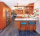 Elin gutted the kitchen for a fresh start for the retrograde. She removed the soffits and laid flooring that matched the rest of the house and designed custom cabinets for the space. “We simplified the placement of lighting and created a clean bank of floor-to-ceiling wall cabinets,” Elin says. “We added floating shelves above the peninsula to create the illusion of a ‘wall’ to divide the two spaces, making for a cozier space. We introduced a retro angled-base cabinet and mimicked the angle above on the floating shelf.”
