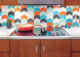 Elin says the overall design was inspired by a vintage booth that was to be used in the layout. “The booth was recovered in turquoise, black, white and red vinyl, with chrome banding and legs. The back of the booth has a large triangular design. It was our intention to use the booth seating, so we carried the angle theme into the cabinetry, shelving and backsplash,” Elin explains. “As we further developed the initial design, we became aware that it was going to feel too cramped using the booths. Instead, we extended the long wall of cabinets and created counter seating with an overhang. But the colors and the angles took on a life of their own and we ran with that same vibe.”