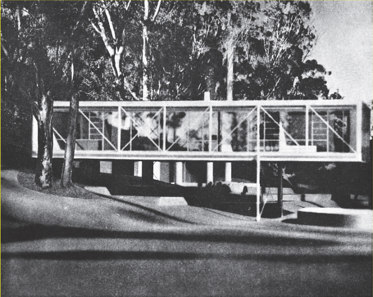 Although they were not realized, the original CSH #8 design was suspended over the ground and sometimes referred to as the “Bridge House.” From the March 1948 issue, the intent was a “free and independent relationship to its natural environment, permitting a choice of participation at the will of the occupants.” It was to be built with a concrete foundation and steel framing.
