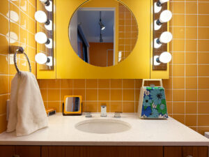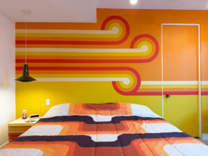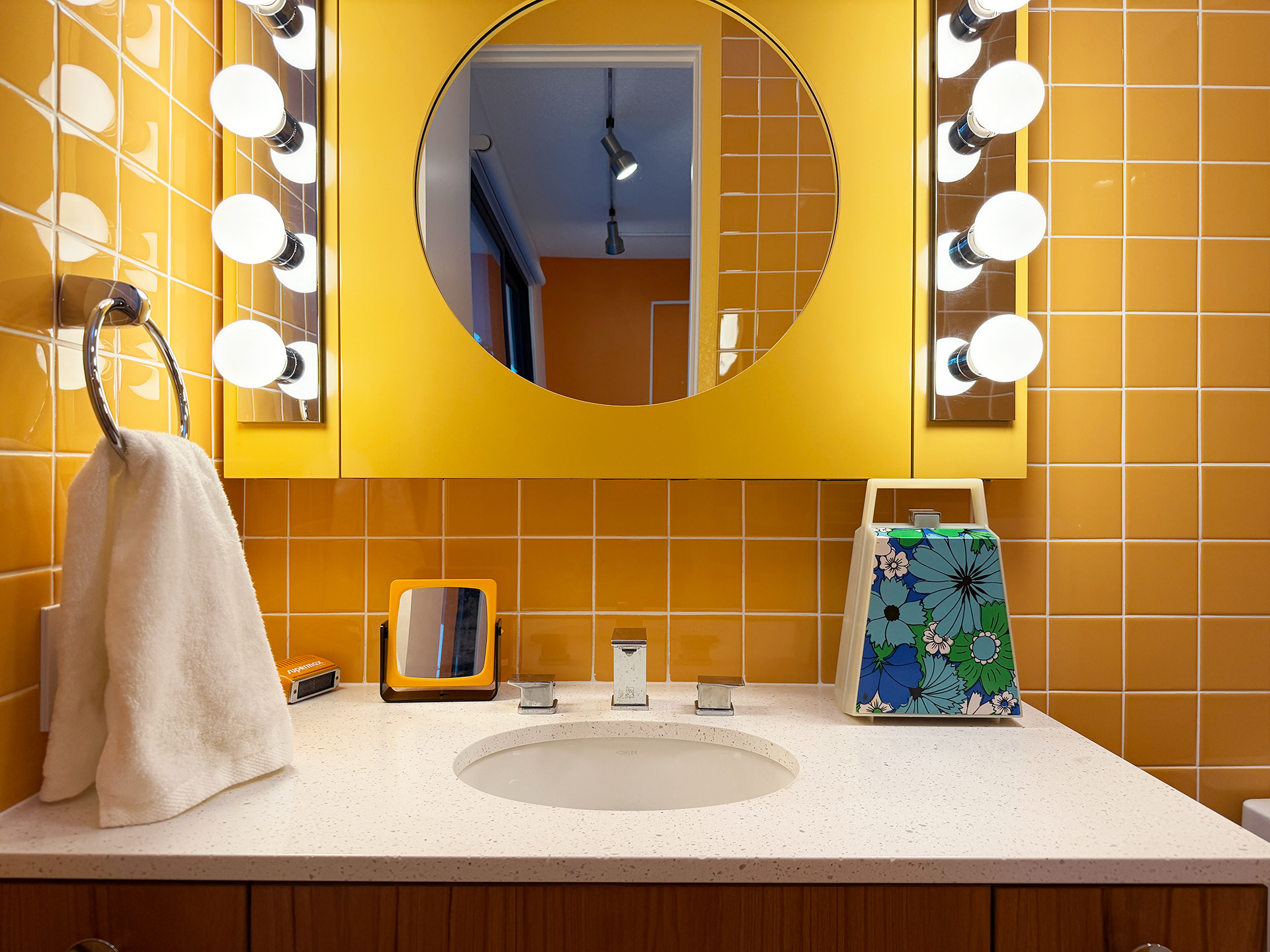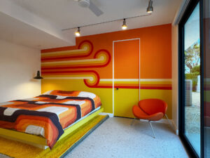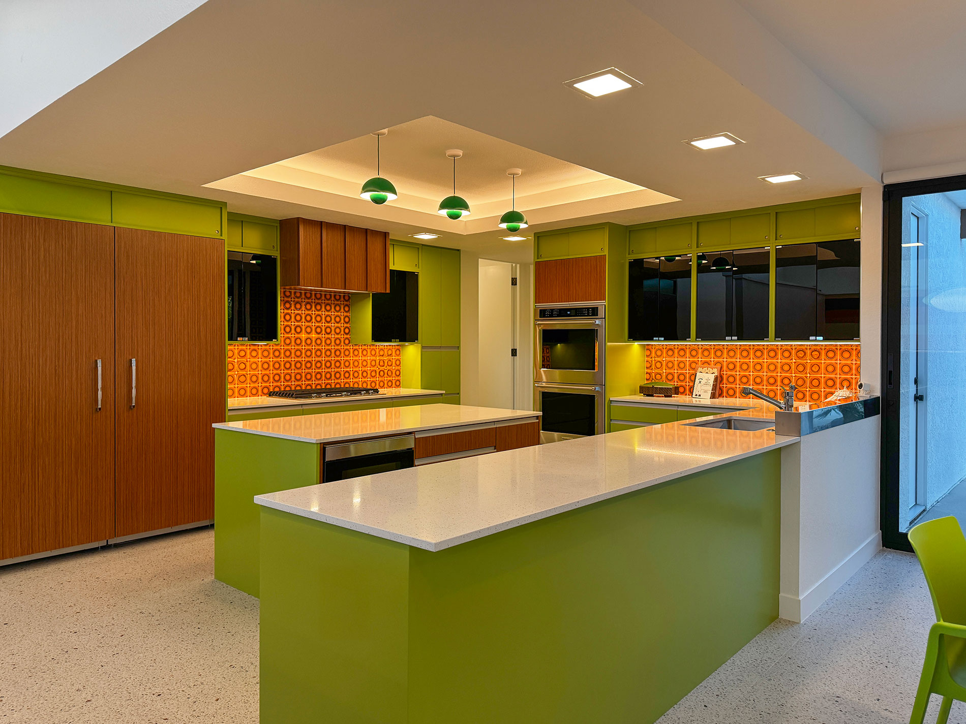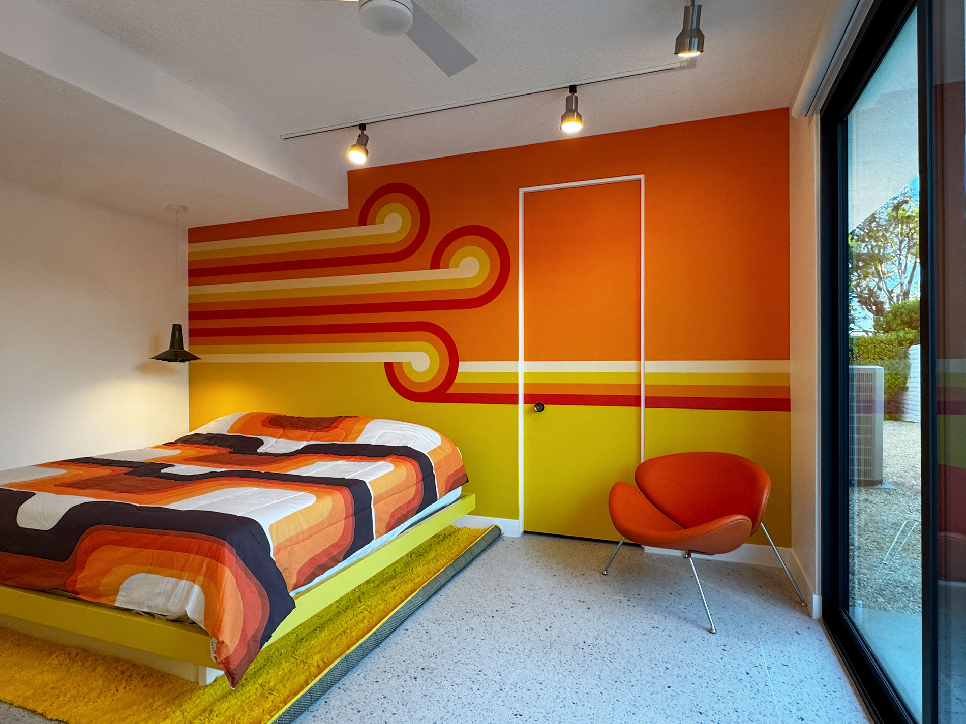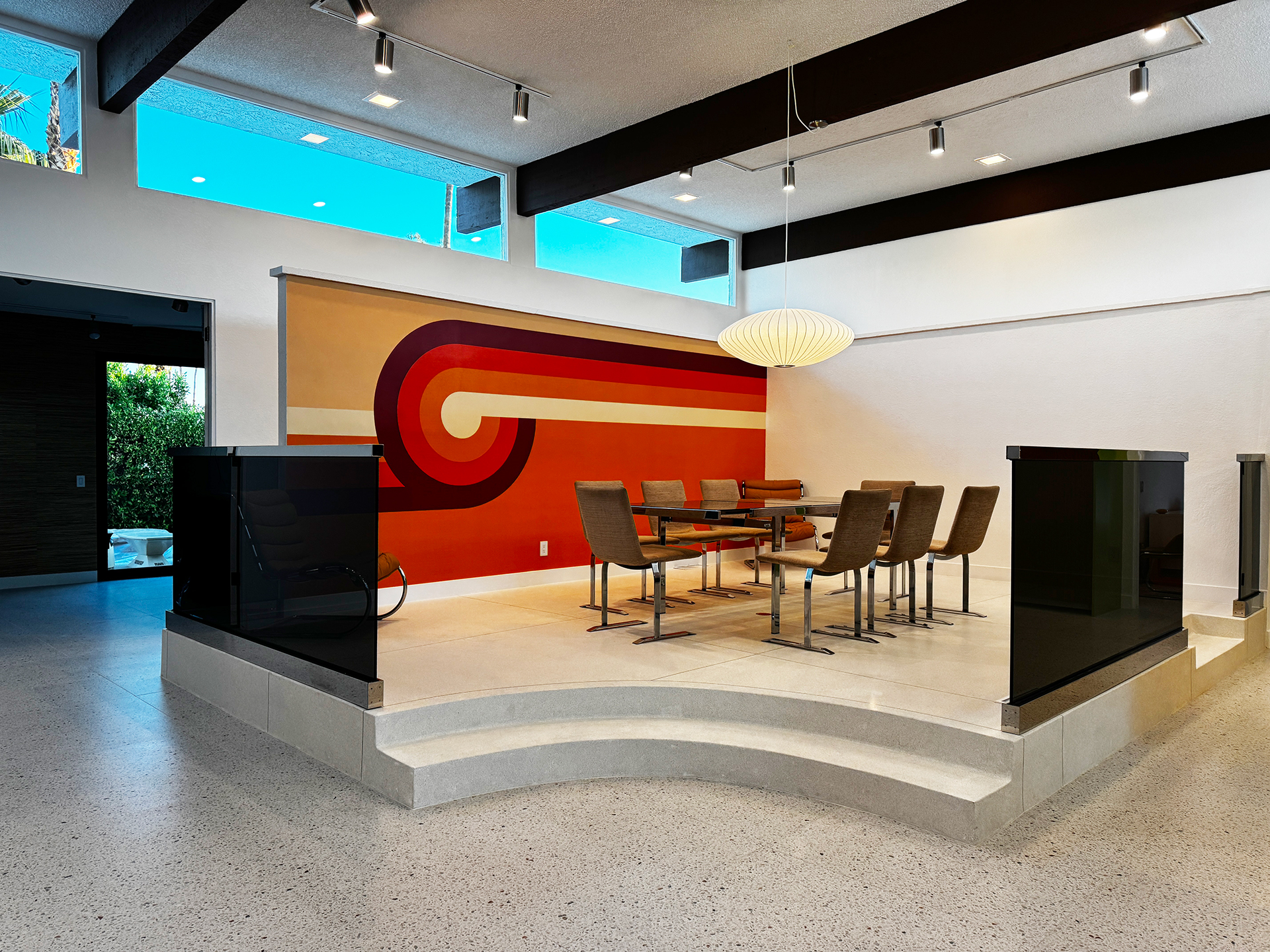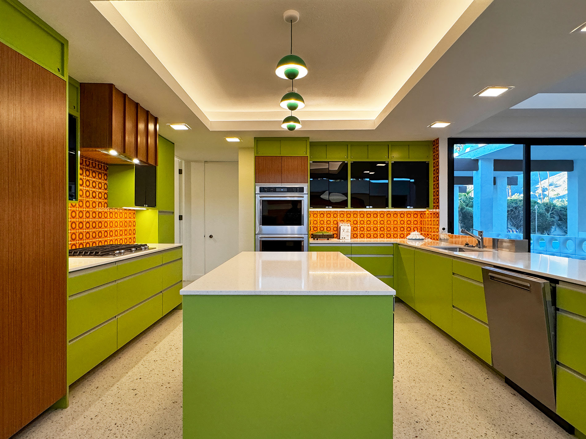 Hal Lacey designed this home in 1974 full of elegant amenities like a raised dining room and a sunken bar. He also set the stage for drama with its striking entry colonnade. Today it’s been revived as a retro dream home full of signature style and bold design details by Mid Century Modern real estate expert Lou Zucaro of Modern Illinois, who’s dedicated his work to celebrating and preserving Mid Century Modern gems in the midwest. Here he brings his mod paradise to life in the desert.