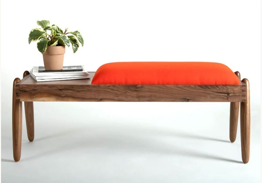 A bench—especially one as dynamic and eye catching as this upholstered walnut one from Hunt & Noyer—can add extra style and function to many spaces.