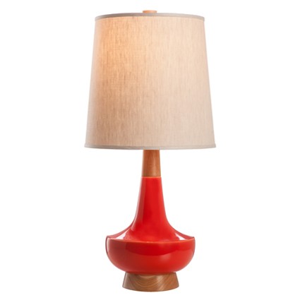 Handmade in Portland, Oregon, the cherry wood, ceramic red and beige linen shade on this lamp are sure to brighten up any room.
