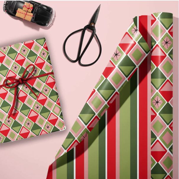Help out your future self by making sure you have mid century Christmas wrapping paper on-hand. Generic Santa paper just won’t do after all your efforts to create a stylish mid mod Christmas! We’ve rounded up 8 mid century Christmas wrapping paper picks to ensure that the presents beneath your tree look as retro-chic as the aluminum tree itself.