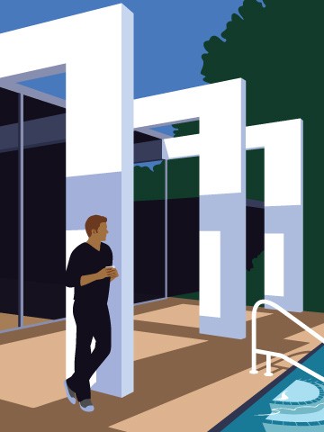 Similarly to the geometric lines and unadorned planes in MCM architecture, Pirman’s work also avoids ornamental detail. “When you subtract details from an image, you give it a kind of symbolic power. My designs are very architectural because they are based on geometry. I like to let what is in the image fuse with the background. For me, it’s about evoking a feeling more than representing a particular image,” says Pirman. While elements are clearly flattened in favor of simplicity of form, he uses the illusion of perspective to lend a sense of real dimension to his illustrations. All of the elements have their chance to shine.