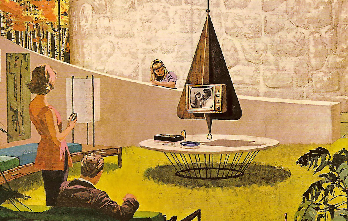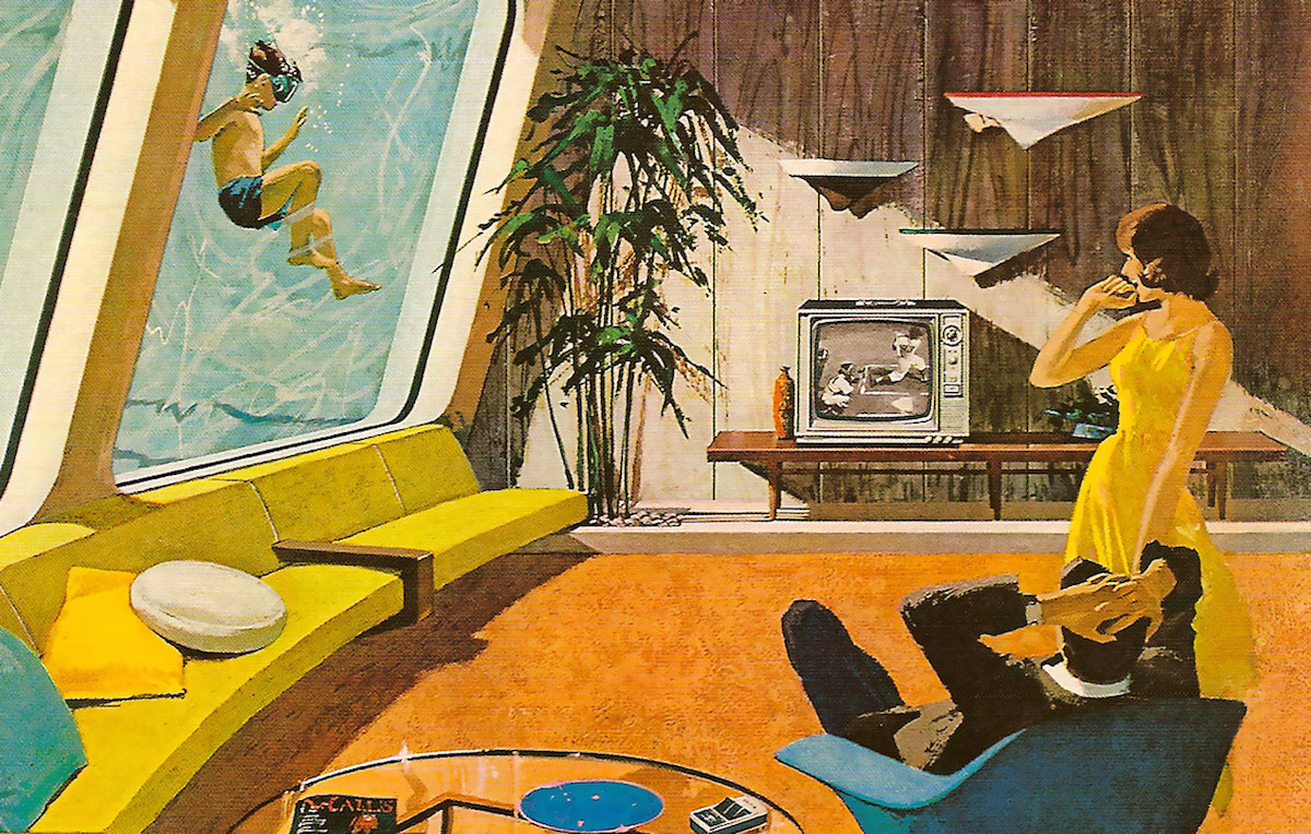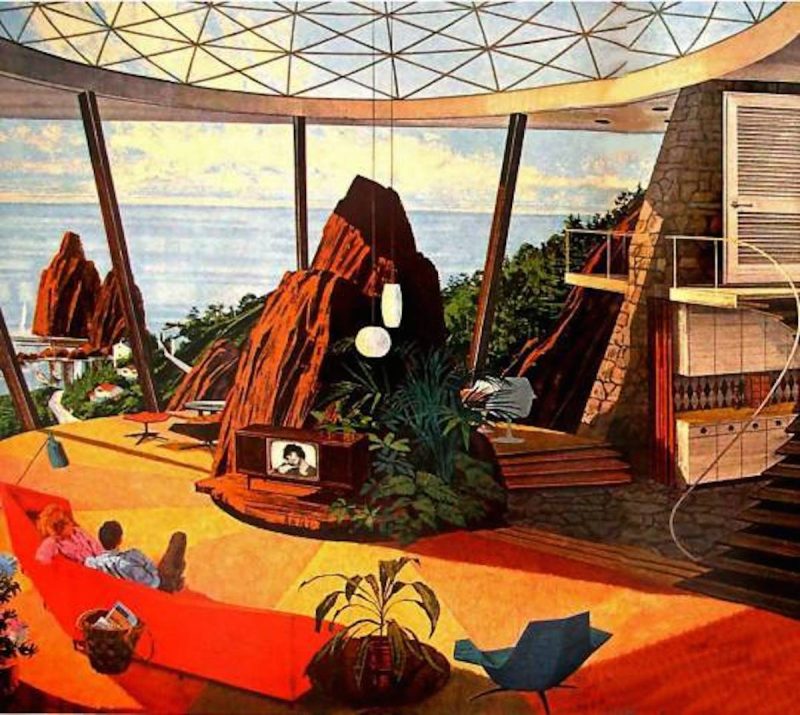 When you look at ad above, depicting a couple watching a baseball game on tv, most of the interior decor looks attainable. There is gorgeous wood paneling, huge windows, sculptural artwork and typical mid century furniture. It could be anybody’s home if you just ignore the fact that it appears that the exterior wall seems to be under water.